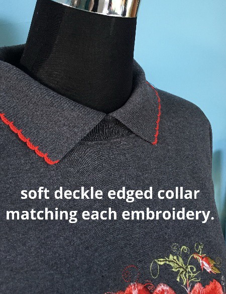 It has a soft deckle edged collar sewn into it, matching the quirky modern embroidery.