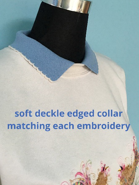 It has a soft deckle edged collar sewn into it, matching the quirky modern embroidery.