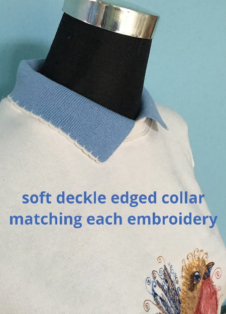 It has a soft deckle edged collar sewn into it, matching the quirky modern embroidery.