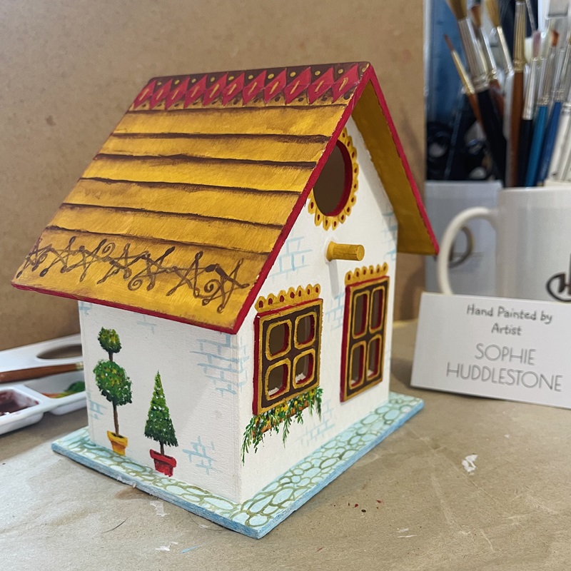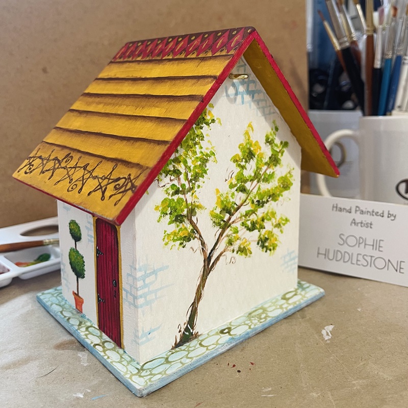 This wooden bird box is size 15cm tall X 15cm wide X 11cm deep. Hand painted in artist quality acrylic paints and oil based paints. varnished with non yellowing outdoor wood varnish. It has a metal loop on the back (near to the roof) for you to use to attatch rope. Rope not included. Photos below show the other sides to the bird box as it is lovingly hand painted all over. A discounted price, when bought directly in person from my art studio in Burbage village, rather than online, may be available. If you have any questions about this bird box please do get in touch, and visit the ‘reminders‘ page before you go, thanks Soph.