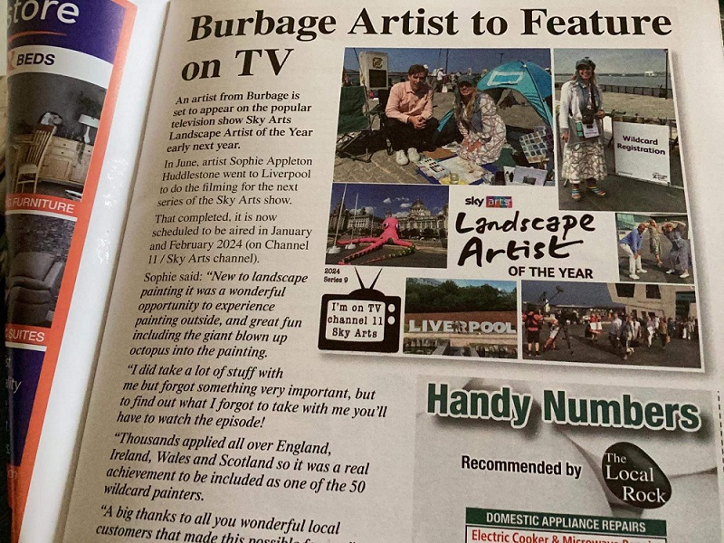 Burbage Artist Sophie “Artist Sophie Appleton Huddlestone” has been published in a magazine and is set to appear on your TV screens on the Sky Arts television show Landscape Artist of The Year, series 9 in Jan/Feb 2024.