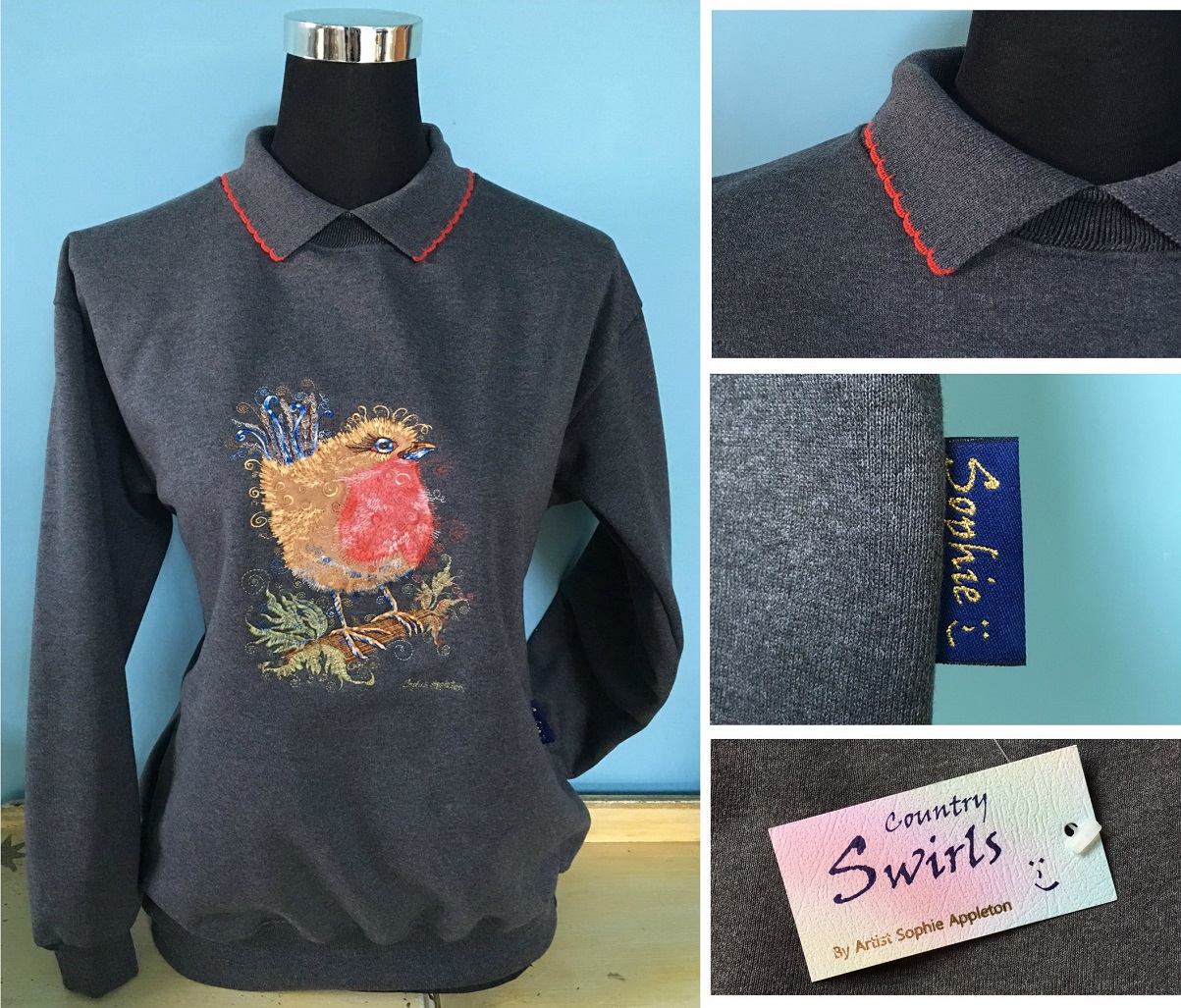 Embroidered Ladies Sweaters for sale designed by Sophie. Only a few remaining. Choose your size sweater carefully, as refunds are not available for ordering the incorrect size. Sizes measurements are: Small Size.Similar to an adult UK size 10. (when it lays flat measures approximately chest 20″, neck seam to hem 25″, under arm to cuffContinue reading “Buy Ladies Sweater with collar, Grey, Rockin Robin, Size S M L”