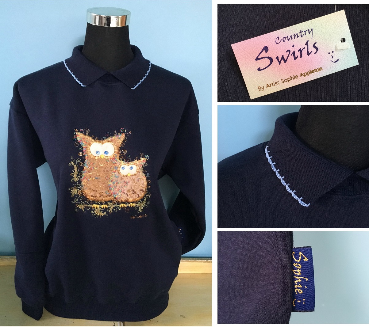 Embroidered Ladies Sweaters for sale designed by Sophie. Only a few remaining. Choose your size sweater carefully, as refunds are not available for ordering the incorrect size. Sizes measurements are: Small Size.Similar to an adult UK size 10. (when it lays flat measures approximately chest 20″, neck seam to hem 25″, under arm to cuffContinue reading “Buy Ladies Sweater with collar, navy, Owl, Size S L”