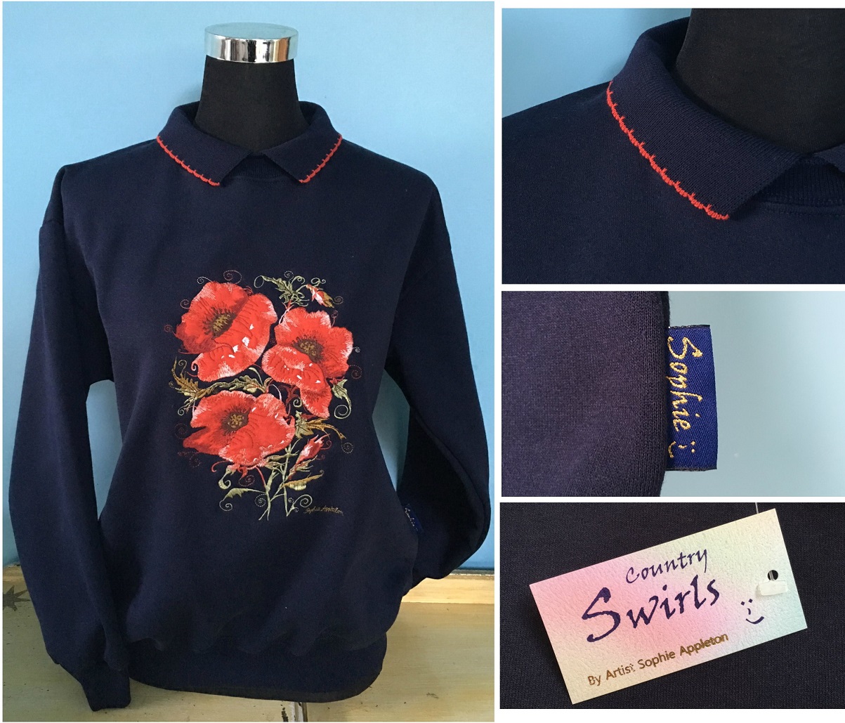 Embroidered Ladies Sweaters for sale designed by Sophie. Only a few remaining. Choose your size sweater carefully, as refunds are not available for ordering the incorrect size. Sizes measurements are: Small Size.Similar to an adult UK size 10. (when it lays flat measures approximately chest 20″, neck seam to hem 25″, under arm to cuffContinue reading “Buy Ladies Sweater with collar, navy, Poppy, size S.”